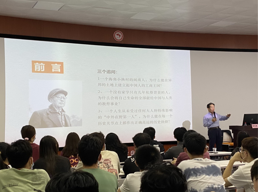 讲座中,朱水涌从“一个海角小渔村的闽南人,为什么能在异邦的土地上建立起中国人的工商王国?一个没有家学只有几年私塾背景的人,为什么会将自己生命的全部献给中国与人类的教育事业?一个人生从未受过任何大人物特殊影响的“中外在野第一人”,为什么能在每一个历史关节点上都作出正确高远的历史抉择?”三个追问展开,为我们展现了一个从闽南渔村走出来的“中外在野第一人”生命的高山仰止。