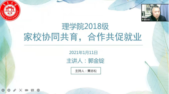 为进一步贯彻落实2022届福建省高校毕业生就业创业工作推进会会议精神,1月11日晚,理学院通过腾讯会议召开了18级毕业班就业家校线上联系会议,院党委副书记郭金锭、辅导员黄志松、全体18级毕业生及学生家长参加会议。