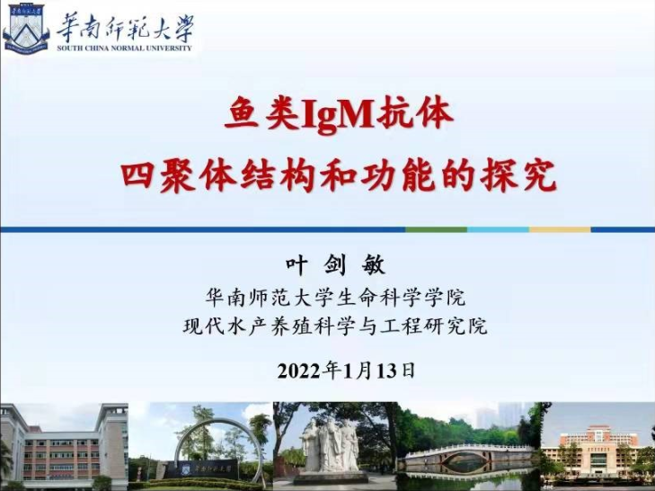 近日,华南师范大学博士生导师叶剑敏教授应水产学院邀请,通过腾讯会议与学院师生开展学术交流。叶剑敏长期从事水产经济动物基础免疫学和健康养殖技术的研究,在本次交流活动中叶教授作了题为“鱼类IgM抗体四聚体结构和功能的探究”的学术报告。报告会由水产学院副院长、陈天圣教授主持,学院部分师生参加。