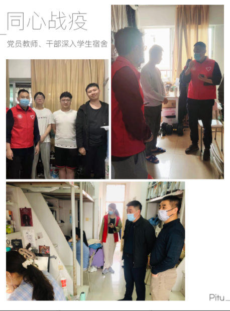 学院党委书记陆宝忠带领全体院领导下沉防疫一线,靠前指挥,深入学生宿舍,关心看望学生,宣传阐释学校防疫政策,加强心理疏导和人文关怀。院长许志龙在其担任班主任的班级建立“班干部和宿舍长”微信群,为学生排忧解难;在疫情期间每天上午7:30召开微信现场视频会,检查宿舍卫生状况,督促学生养成学习生活好习惯,共同营造良好氛围。