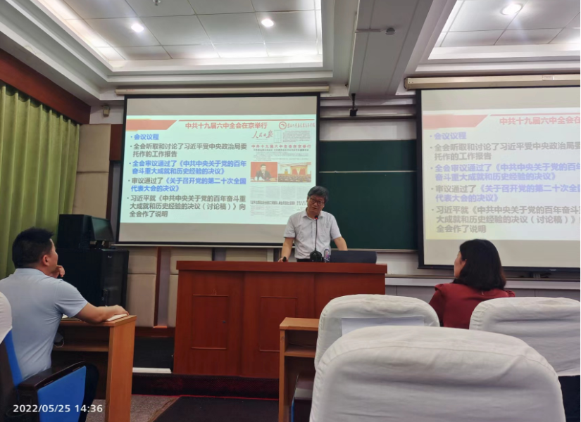 5月25日下午,工商管理学院邀请马克思主义学院梅进禄副教授为全院教职工作题为《以伟大的历史经验赢得更加伟大的胜利和荣光——认真学习党的十九届六中全会精神》的专题辅导报告。讲座由学院党委副书记董欣胜主持,全院教职工到场聆听。