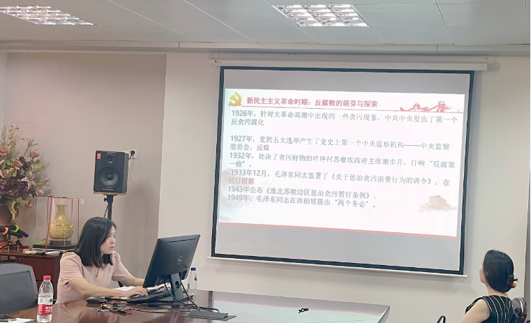 党课围绕中国共产党百年反腐败斗争的历程、中国共产党百年反腐的鲜明特征以及中国共产党百年反腐的经验与启示三个方面进行了讲解,提醒与会党员坚持思想淬炼,筑牢廉洁防线。