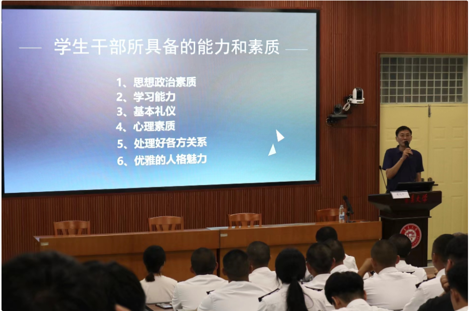 曹兆平从学生干部的作用、必备素养、基本职责等多方面入手,着重强调了作为学生干部所应具备的能力,同时提出六点具体可行的要求:一、提升思想政治素质,主动奉献,争做楷模;二、合理规划学习任务,以身作则;三、注重基本礼仪,培养社会公德与社会服务意识;四、提升心理素质与抗压能力;五、协调各方关系,平衡需求,疏解矛盾;六、养成优雅的人格魅力。