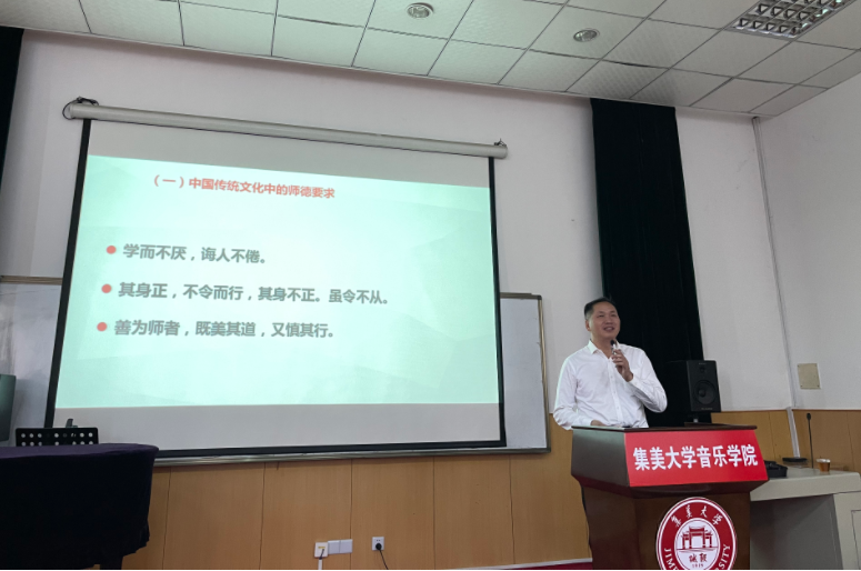 为贯彻落实习近平总书记关于教育的重要论述,扎实推进学院师德师风建设工作,进一步弘扬新风正气,12月7日下午,音乐学院邀请马克思主义学院肖仕平教授为全体教职工作了一场题为“认知职业规范,弘扬高尚师德”的师德师风专题讲座。本次讲座由学院党委副书记洪妍妮主持。