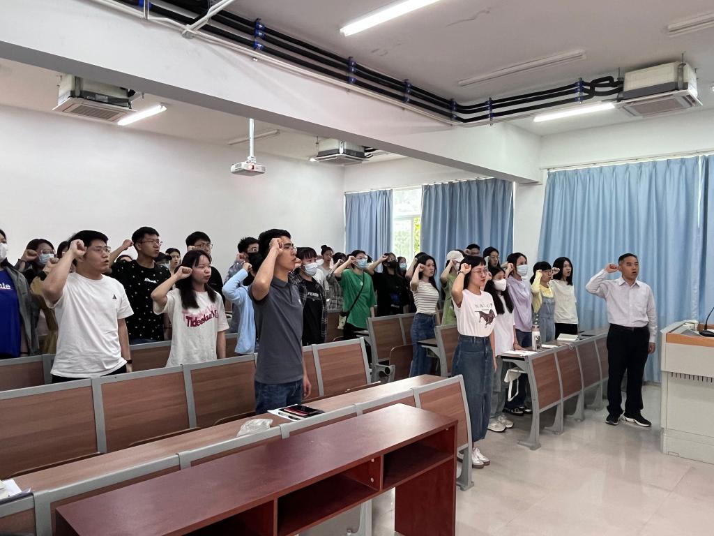 全体毕业生党员面向党旗,高举右手,重温入党誓词。朱坤道为毕业班党员上题为《牢记党员身份,让青春在新征程中绽放绚丽之花》的主题教育专题党课。他充分肯定了毕业生党员在大学期间的优秀表现,并结合毕业生思想教育和管理服务工作,对全体毕业生党员提出希望。