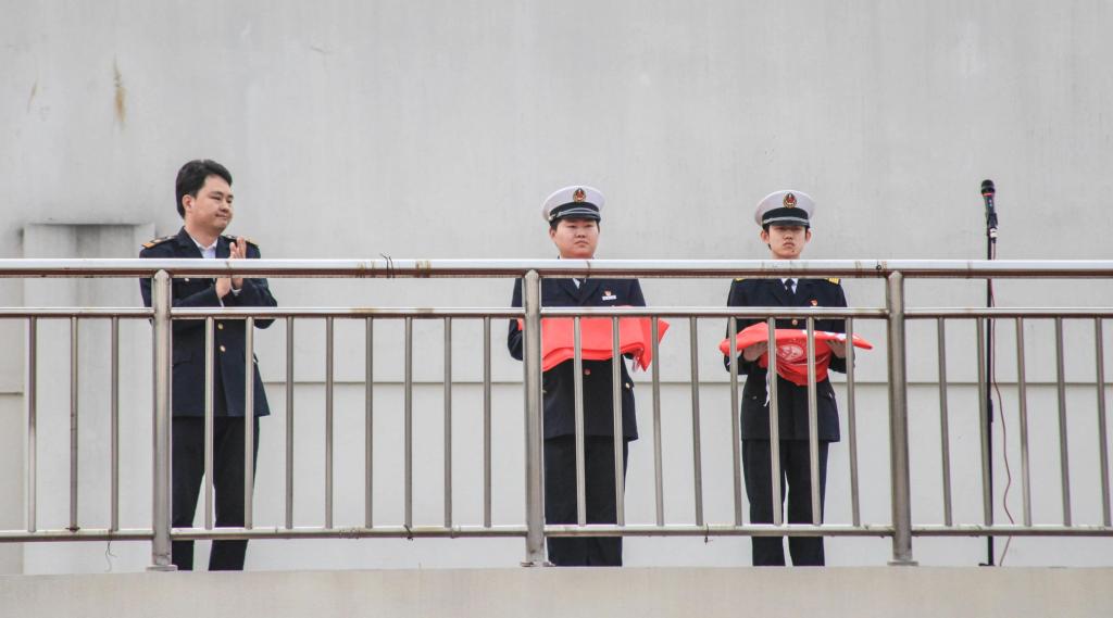 4月15日,轮机工程学院在轮机操场举行一场特殊的赠旗仪式,赠予对象为学院新加入中国极地中心的三名学生:轮机20级武杨力,船电20级汪俊峰、高杨博。院党委副书记赖龙荣主持仪式。