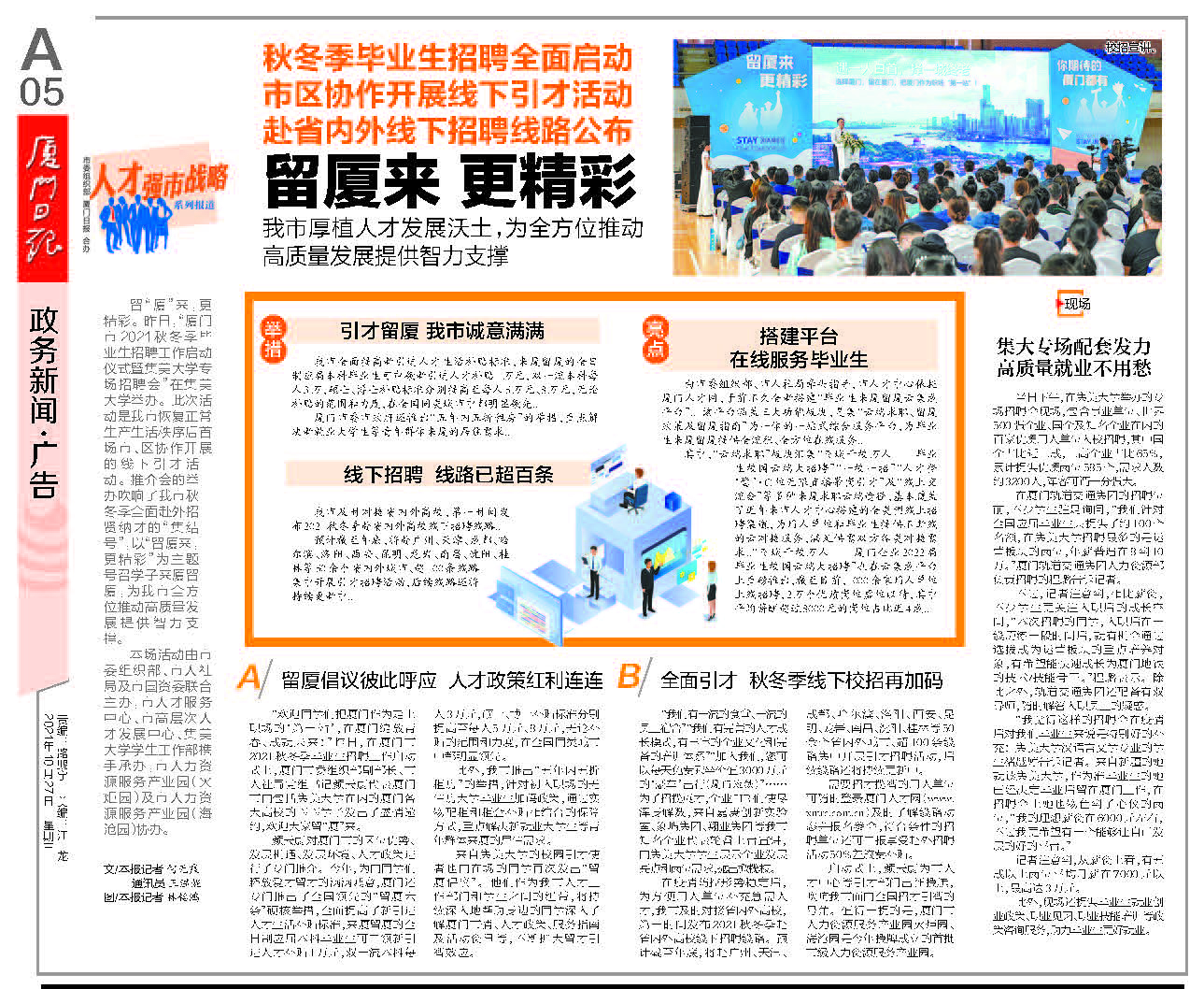 “欢迎同学们把厦门作为走上职场的‘第一站’,在厦门绽放青春、成就未来!”昨日,在厦门市2021秋冬季毕业生招聘工作启动式上,厦门市委组织部副部长、市人社局党组书记颜云蔚代表厦门市向包括亚洲中文精品乱码在内的厦门各大高校的莘莘学子发出了盛情邀约,欢迎大家留“厦”来。