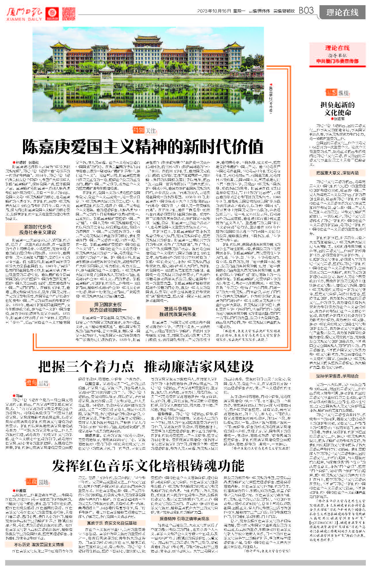 陈嘉庚被毛泽东主席誉为“华侨旗帜 民族光辉”,习近平总书记评价他“是侨界的一代领袖和楷模”。2014年,习近平总书记给集美校友总会回信中,希望广大华侨华人弘扬“嘉庚精神”,深怀爱国之情,坚守报国之志。嘉庚精神是陈嘉庚一系列人格品质和优良作风的统称,具有丰富多元的内容。爱国主义是中华民族精神的核心,也是嘉庚精神的本质特征。在新时代,面对中华民族伟大复兴战略全局和世界百年未有之大变局,深入阐述陈嘉庚爱国主义精神的核心要义、发掘其新时代价值具有重要的理论和实践意义。