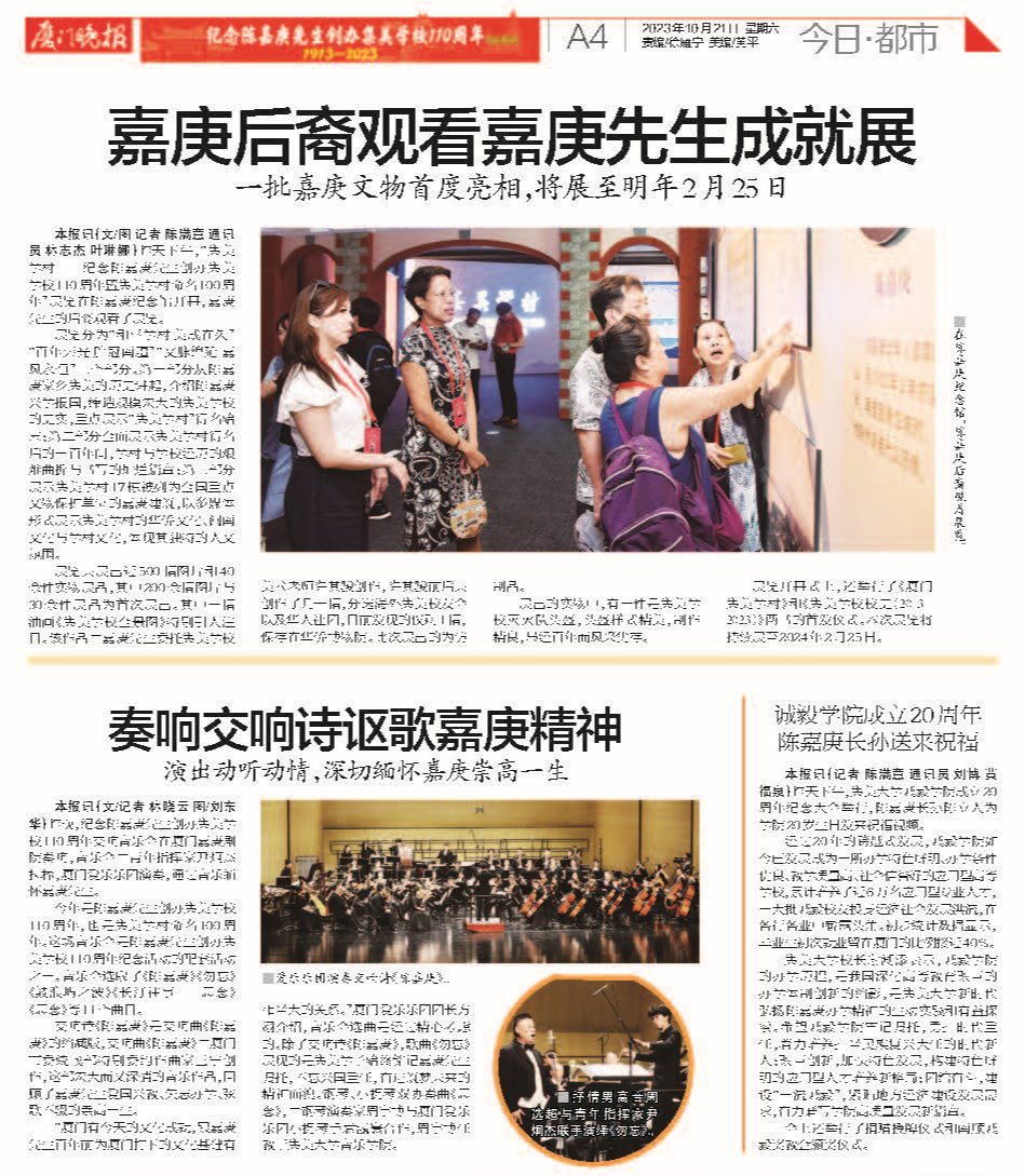 本报讯(记者 陈满意 通讯员 刘博 黄福泉)昨天下午,亚洲中文精品乱码诚毅学院成立20周年纪念大会举行,陈嘉庚长孙陈立人为学院20岁生日发来祝福视频。