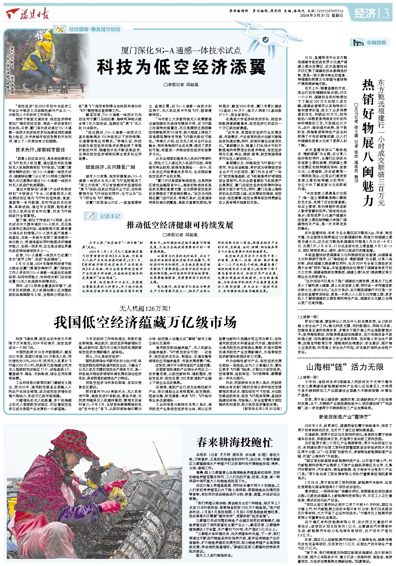 “厦门不仅是国家物流枢纽,也是两岸区域性金融服务中心。高效的物流体系是经济发展的重要支撑,也为探索低空经济的发展提供了更宽阔的舞台。”谈及为何选择在厦门进行试点,李锋凡表示,这里通信网络的高比例覆盖,是极为重要的原因。资料显示,截至2023年底,厦门市累计建成5G基站1.46万个,每万人拥有5G基站数27.5个,居全省首位。